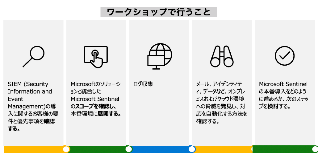 Microsoft Sentinel WorkShopを通じて、SIEMによるセキュリティ情報の収集、分析、脅威の検知、対応について理解いただくとともに、日々変化し複雑化するIT環境に対し、運用負荷を抑えつつセキュリティ情報を集約し可視化するための方法について理解いただきます。